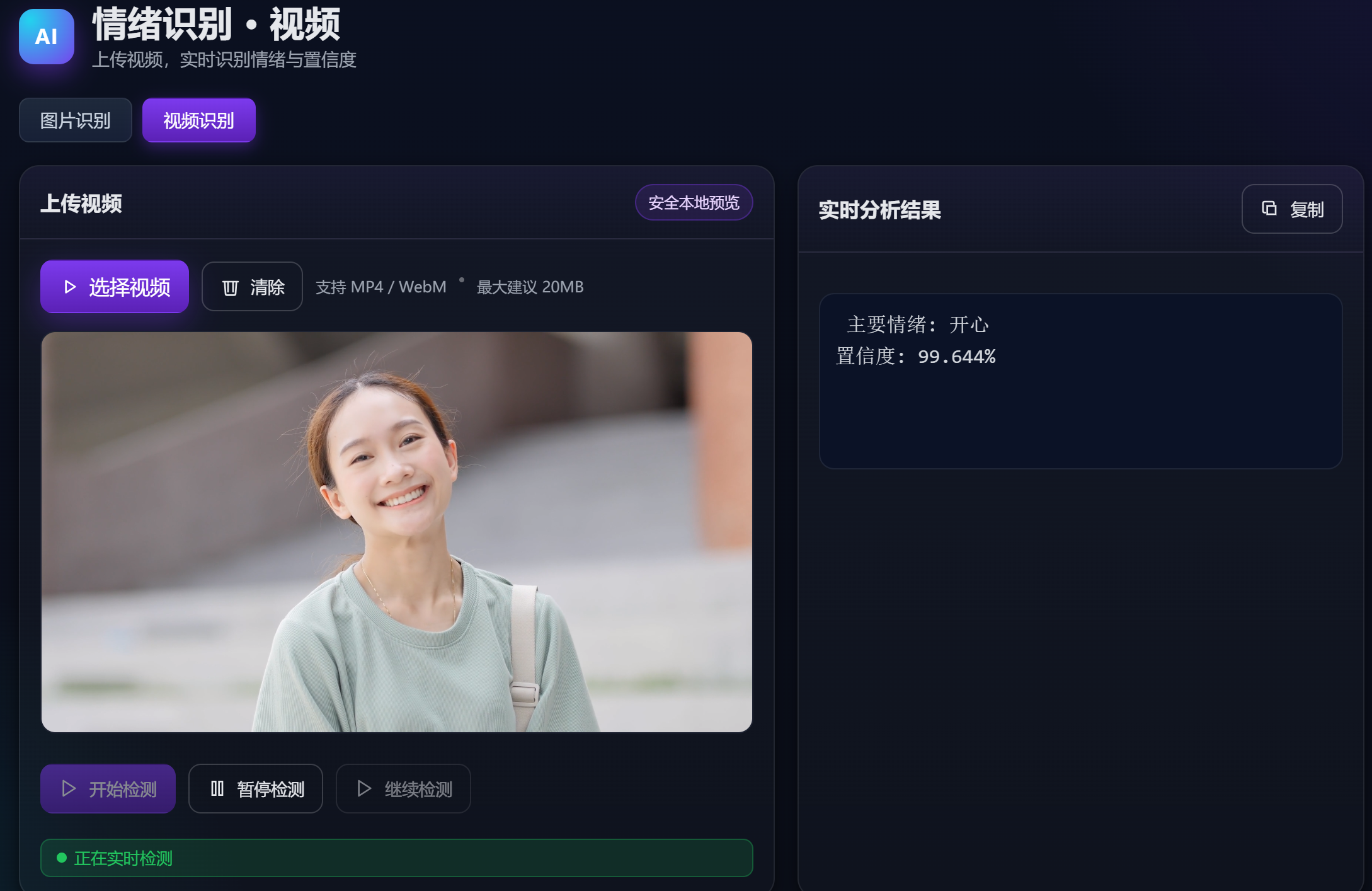团队开发的情绪识别系统可通过图片与视频两种方式实现情绪检测。图片识别可返回最高置信度的人脸情绪,视频识别支持实时帧分析。该系统可应用于用户体验优化、情感反馈收集等场景,为相关领域提供高效的情绪分析工具。